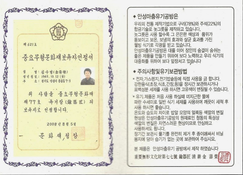 안성유기 모든 제품에는 중요무형문화재 제77호 안성유기 인증서가 제공됩니다.
