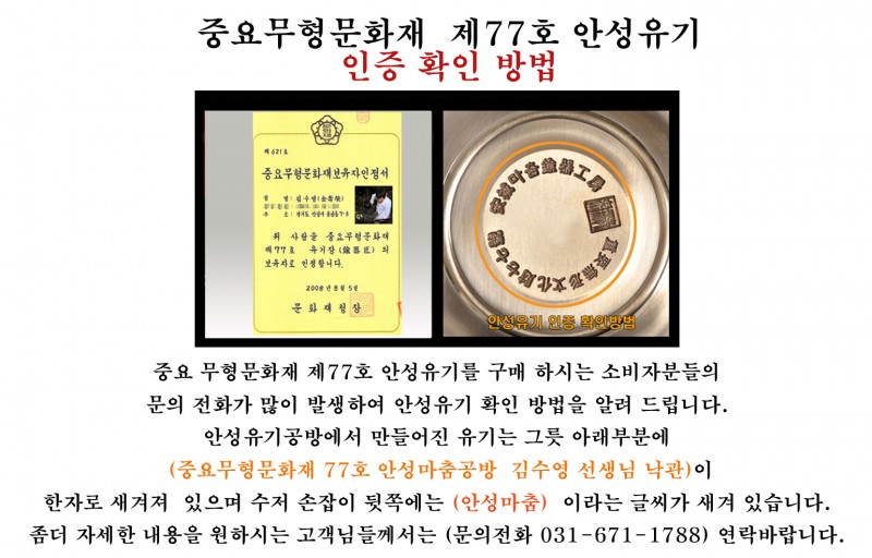 중요 무형문화재 제77호 안성유기를 구매 하시는 소비자분들의 문의 전화가 많이 발생하여 안성유기 확인 방법을 알려 드립니다. 안성유기공방에서 만들어진 유기는 그릇 아래부분에 (중요무형문화재 77호 안성마춤공방 김수영 선생님 낙관)이 한자로 새겨져 있으며 수저 손잡이 뒷쪽에는 (안성마춤) 이라는 글씨가 새겨 있습니다. 좀더 자세한 내용을 원하시는 고객님들께서는 문의 전화 031-671-1788로 연락주시기 바랍니다.